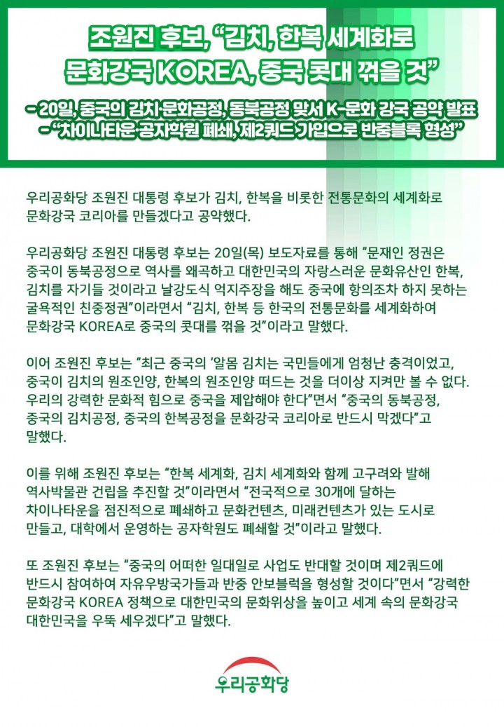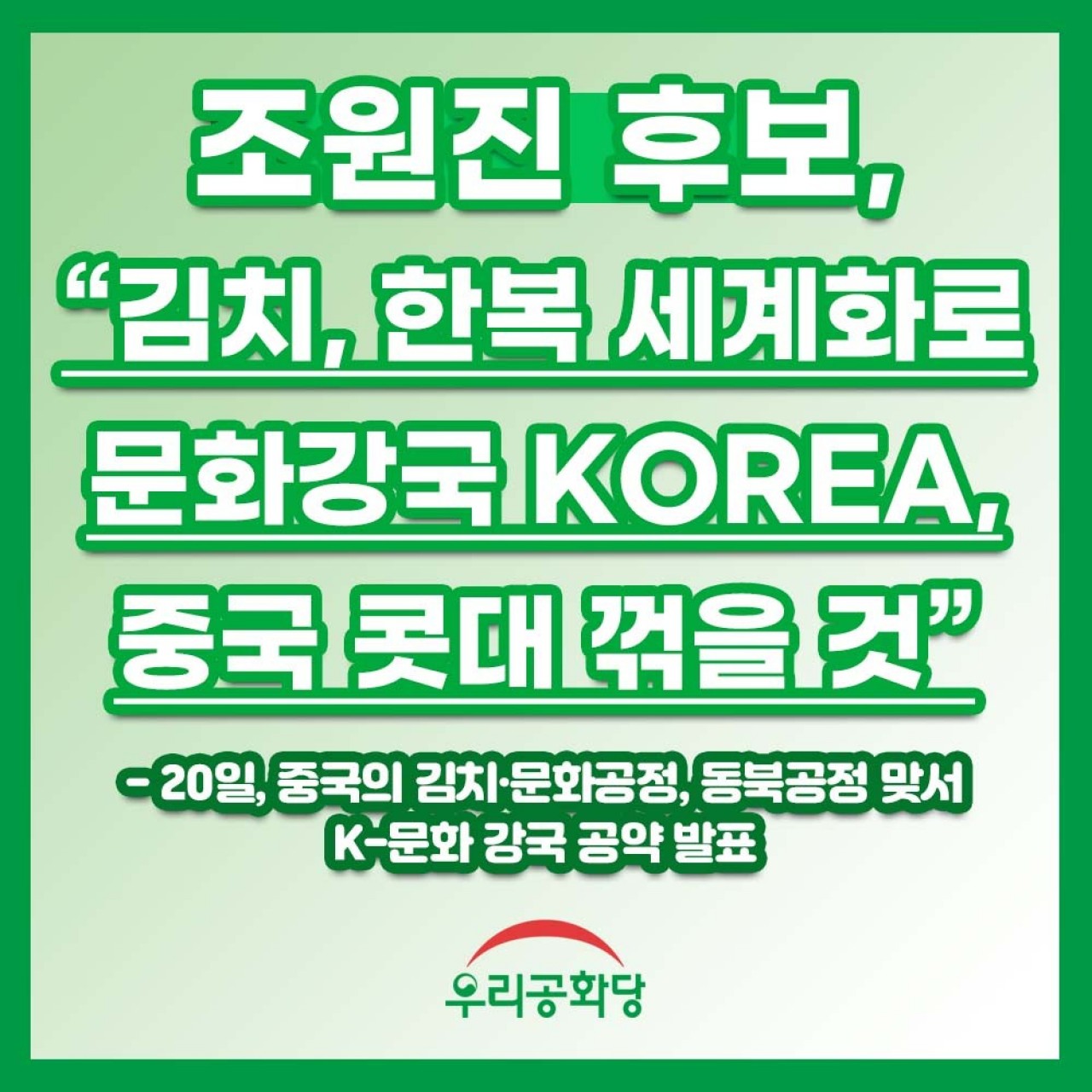 ¿ì¸®°øÈ­´ç Á¶¿øÁø ´ëÅë·É È帴 20ÀÏ(¸ñ) º¸µµÀڷḦ ÅëÇØ "¹®ÀçÀÎ Á¤±ÇÀº Áß±¹ÀÌ µ¿ºÏ°øÁ¤À¸·Î ¿ª»ç¸¦ ¿Ö°îÇÏ°í ´ëÇѹα¹ÀÇ ÀÚ¶û½º·¯¿î ¹®È­À¯»êÀÎ ÇѺ¹, ±èÄ¡¸¦ ÀÚ±âµé °ÍÀ̶ó°í ³¯°­µµ½Ä ¾ïÁöÁÖÀåÀ» ÇØµµ Áß±¹¿¡ Ç×ÀÇÁ¶Â÷ ÇÏÁö ¸øÇÏ´Â ±¼¿åÀûÀΠģÁßÁ¤±Ç"À̶ó¸é¼­ "±èÄ¡, ÇѺ¹ µî Çѱ¹ÀÇ ÀüÅ빮ȭ¸¦ ¼¼°èÈ­ÇÏ¿© ¹®È­°­±¹ KOREA·Î Áß±¹ÀÇ Äà´ë¸¦ ²ªÀ» °Í"À̶ó°í ¸»Çß´Ù.