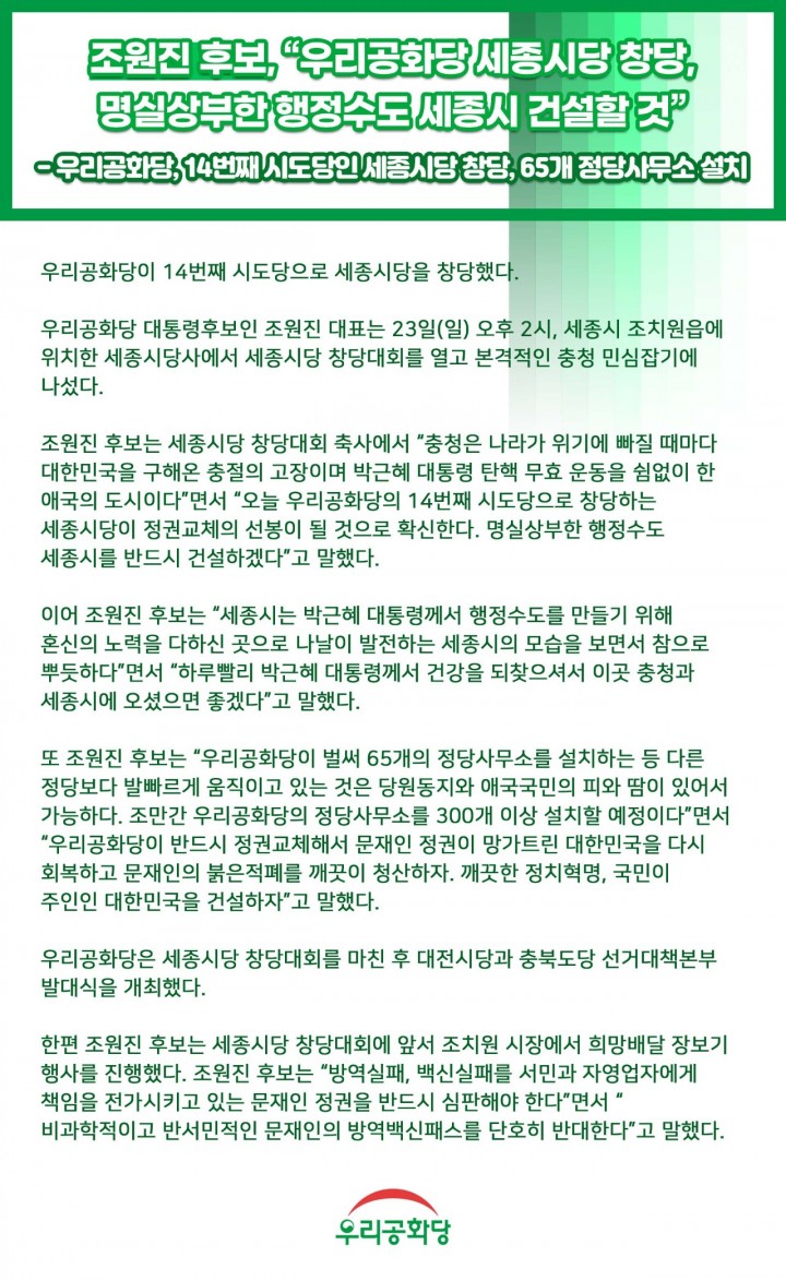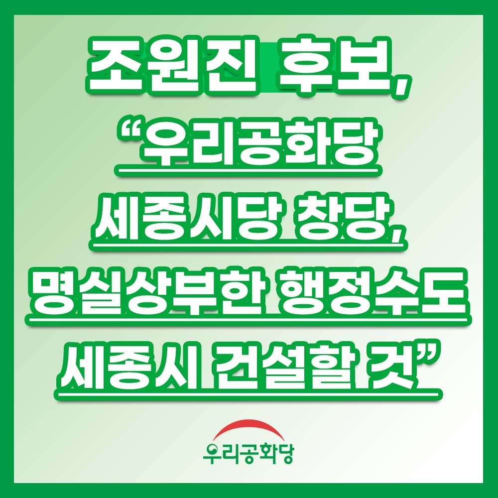 <º¸µµÀÚ·á> Á¶¿øÁø Èĺ¸, ¿ì¸®°øÈ´ç ¼¼Á¾½Ã´ç â´ç, ¸í½Ç»óºÎÇÑ ÇàÁ¤¼öµµ ¼¼Á¾½Ã °Ç¼³ÇÒ °Í