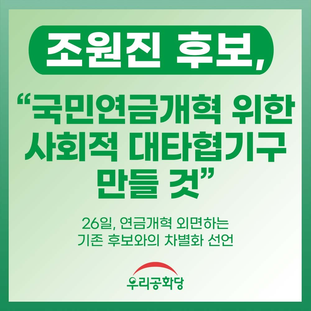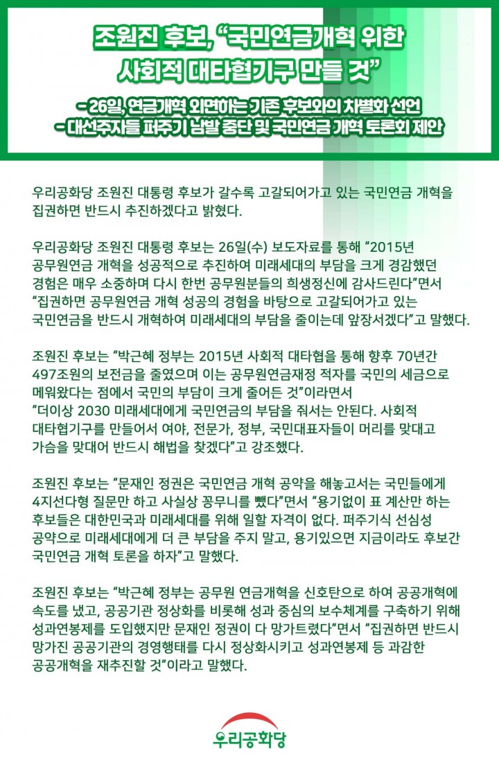 Á¦¸ñ : <º¸µµÀÚ·á> Á¶¿øÁø Èĺ¸, ±¹¹Î¿¬±Ý°³Çõ À§ÇÑ »çȸÀû ´ëŸÇù±â±¸ ¸¸µé °Í, 26ÀÏ, ¿¬±Ý°³Çõ ¿Ü¸éÇÏ´Â ±âÁ¸ Èĺ¸¿ÍÀÇ Â÷º°È­ ¼±¾ð !