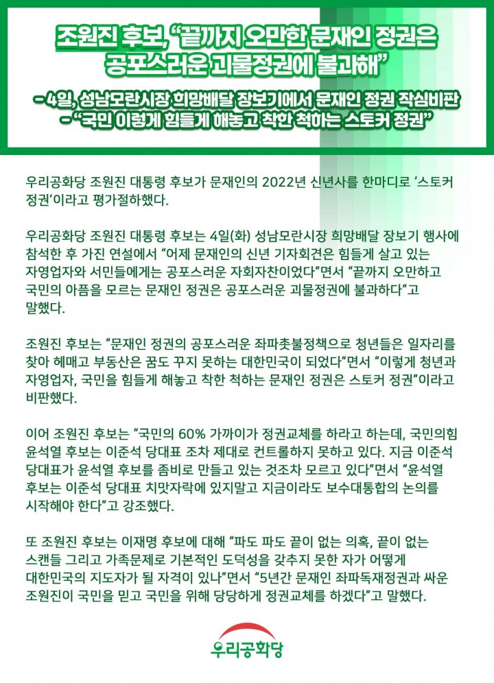 <º¸µµÀÚ·á> Á¶¿øÁø Èĺ¸, ¹Ú±ÙÇý ´ëÅë·É ¼®¹æÀÌ 2022³â ±¹¹Î¿¡°Ô Èñ¸ÁÀ» Áà, ¿ì¸®°øÈ´ç, 3ÀÏ, º»°ÝÀûÀÎ ´ë¼± µ¹ÀÔ, ¼±°ÅÁغñ ¹ÚÂ÷ !