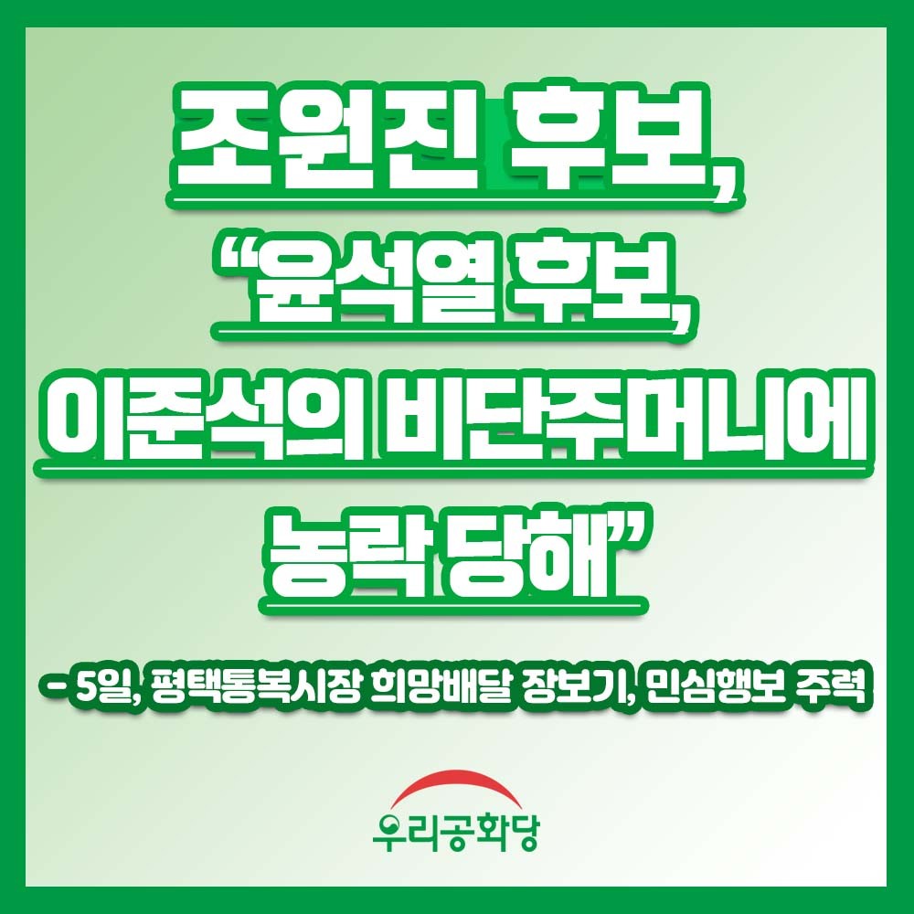 <º¸µµÀÚ·á> Á¶¿øÁø Èĺ¸, À±¼®¿ Èĺ¸, ÀÌÁؼ®ÀÇ ºñ´ÜÁÖ¸Ó´Ï¿¡ ³ó¶ô´çÇØ, 5ÀÏ, ÆòÅÃÅ뺹½ÃÀå Èñ¸Á¹è´Þ À庸±â Çà»ç, ¹Î½ÉÇຸ ÁÖ·Â