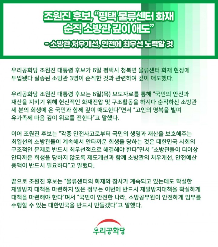 Á¶¿øÁø Èĺ¸, 6ÀÏ"ÆòÅà ¹°·ù¼¾ÅÍ ÈÀç ¼øÁ÷ ¼Ò¹æ°ü