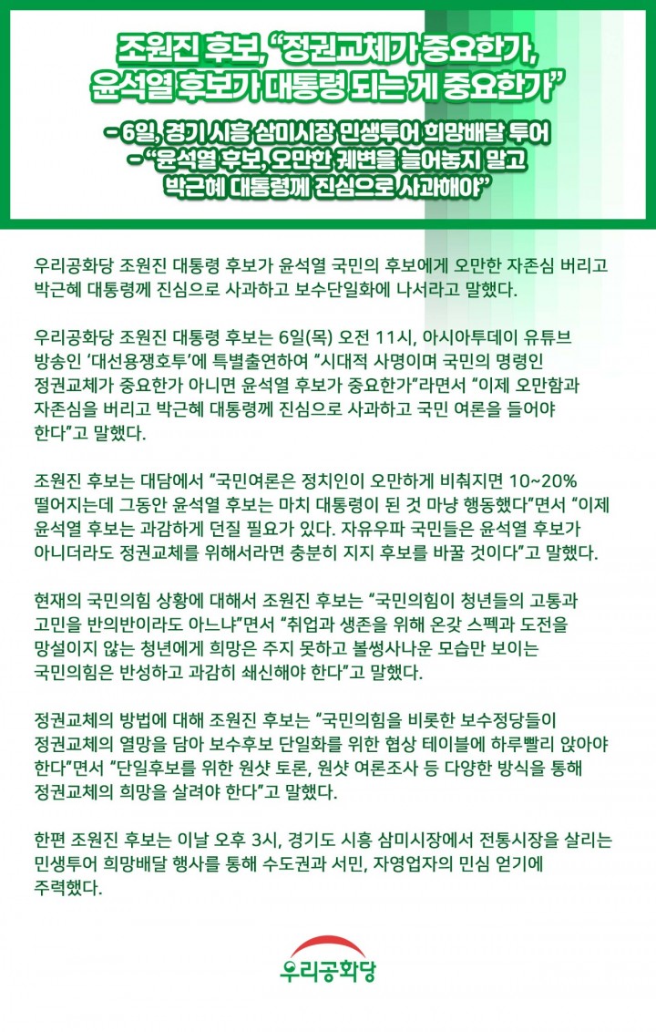¿ì¸®°øÈ´ç Á¶¿øÁø ´ëÅë·É È帰¡ À±¼®¿ ±¹¹ÎÀÇ Èĺ¸¿¡°Ô ¿À¸¸ÇÑ ÀÚÁ¸½É ¹ö¸®°í ¹Ú±ÙÇý ´ëÅë·É²² Áø½ÉÀ¸·Î »ç°úÇÏ°í º¸¼ö´ÜÀÏÈ¿¡ ³ª¼¶ó°í ¸»Çß´Ù.