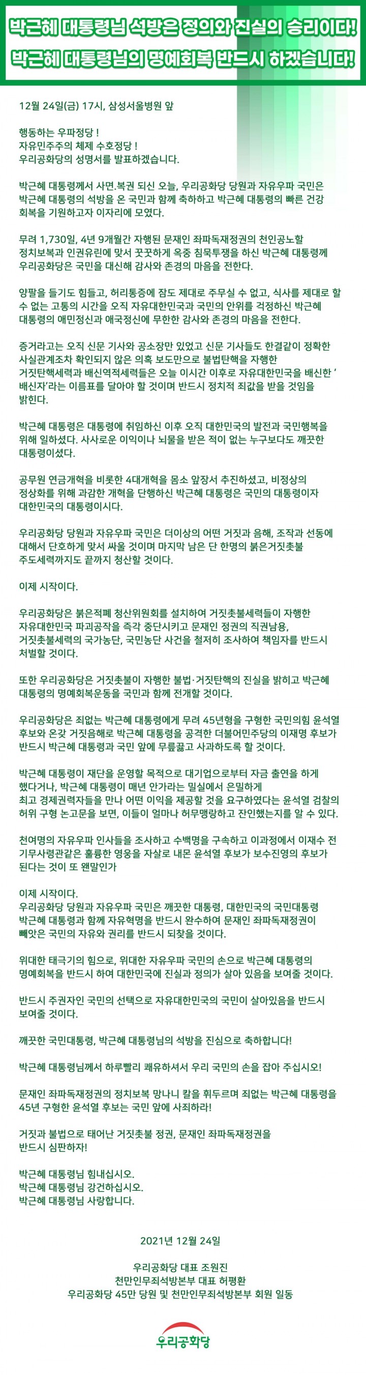 ¹Ú±ÙÇý ´ëÅë·É²²¼ »ç¸é.º¹±Ç µÇ½Å ¿À´Ã, ¿ì¸®°øÈ´ç ´ç¿ø°ú ÀÚÀ¯¿ìÆÄ ±¹¹ÎÀº ¹Ú±ÙÇý ´ëÅë·ÉÀÇ ¼®¹æÀ» ¿Â ±¹¹Î°ú ÇÔ²² ÃàÇÏÇÏ°í ¹Ú±ÙÇý ´ëÅë·ÉÀÇ ºü¸¥ °Ç° ȸº¹À» ±â¿øÇϰíÀÚ ÀÌÀÚ¸®¿¡ ¸ð¿´´Ù.
