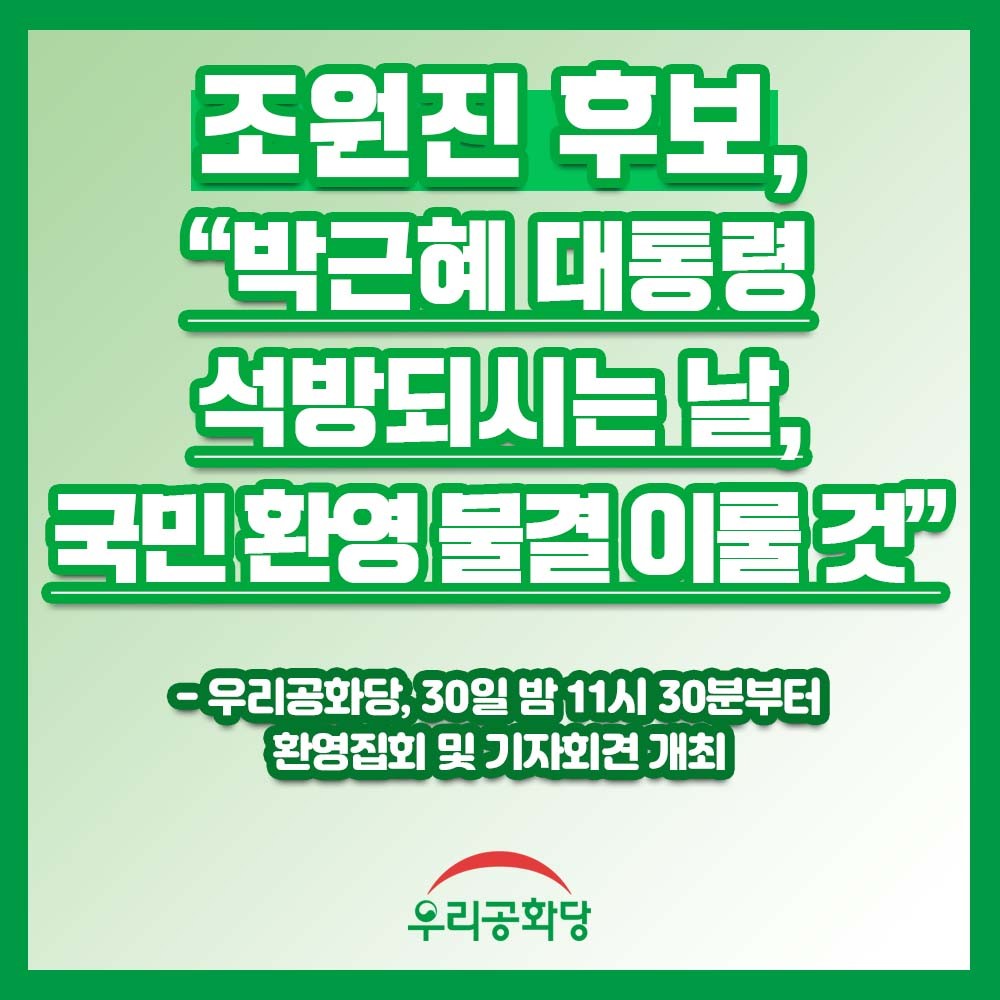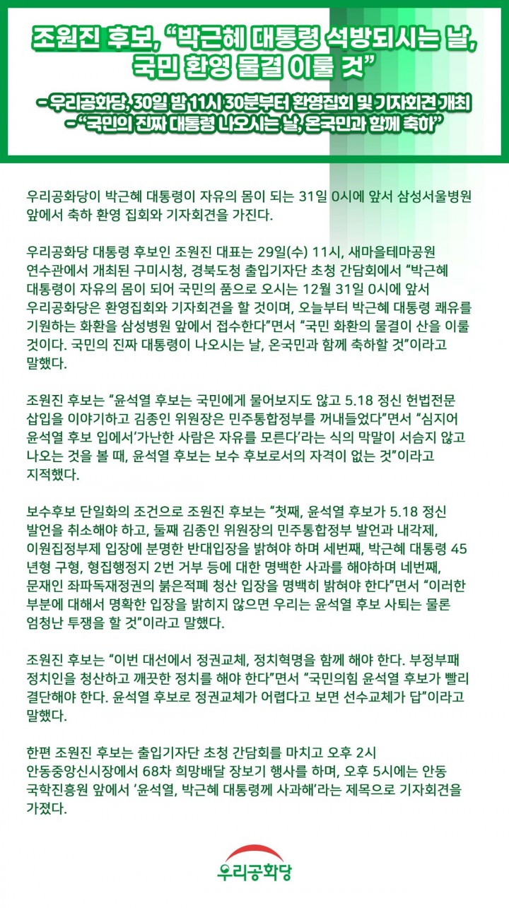 ¿ì¸®°øÈ´ç ´ëÅë·É Èĺ¸ÀÎ Á¶¿øÁø ´ëÇ¥´Â 29ÀÏ(¼ö) 11½Ã, »õ¸¶À»Å׸¶°ø¿ø ¿¬¼ö°ü¿¡¼ °³ÃÖµÈ ±¸¹Ì½Ãû, °æºÏµµÃ» ÃâÀÔ±âÀÚ´Ü ÃÊû °£´ãȸ¿¡¼ "¹Ú±ÙÇý ´ëÅë·ÉÀÌ ÀÚÀ¯ÀÇ ¸öÀÌ µÇ¾î ±¹¹ÎÀÇ Ç°À¸·Î ¿À½Ã´Â 12¿ù 31ÀÏ 0½Ã¿¡ ¾Õ¼ ¿ì¸®°øÈ´çÀº ȯ¿µÁýȸ¿Í ±âÀÚȸ°ßÀ» ÇÒ °ÍÀ̸ç, ¿À´ÃºÎÅÍ ¹Ú±ÙÇý ´ëÅë·É ÄèÀ¯¸¦ ±â¿øÇÏ´Â ÈȯÀ» »ï¼ºº´¿ø ¾Õ¿¡¼ Á¢¼öÇÑ´Ù"¸é¼ "±¹¹Î ÈȯÀÇ ¹°°áÀÌ »êÀ» ÀÌ·ê °ÍÀÌ´Ù. ±¹¹ÎÀÇ ÁøÂ¥ ´ëÅë·ÉÀÌ ³ª¿À½Ã´Â ³¯, ¿Â±¹¹Î°ú ÇÔ²² ÃàÇÏÇÒ °Í"À̶ó°í ¸»Çß´Ù.