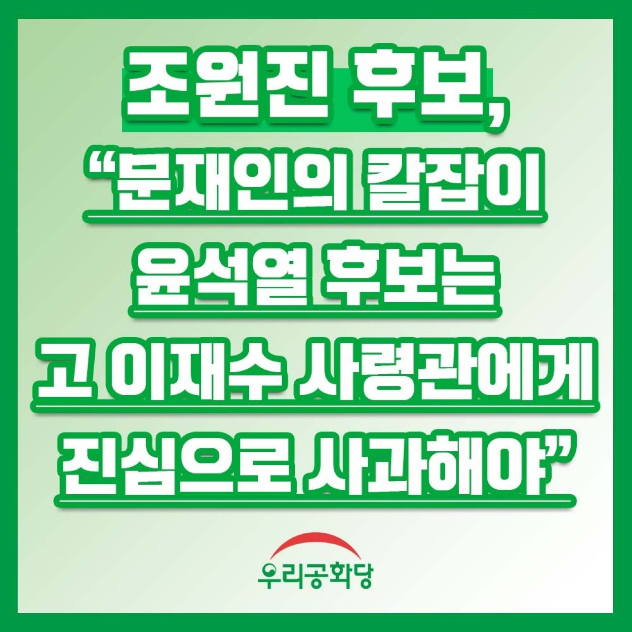 Á¦¸ñ : <º¸µµÀÚ·á> Á¶¿øÁø Èĺ¸, ¹®ÀçÀÎÀÇ Ä®ÀâÀÌ À±¼®¿ È帴 °í ÀÌÀç¼ö »ç·É°ü¿¡°Ô Áø½ÉÀ¸·Î »ç°úÇØ¾ß, ¿ì¸®°øÈ´ç, 7ÀÏ ÀÌÀç¼ö ±â¹«»ç·É°ü 3ÁÖ±â Ã߸ð