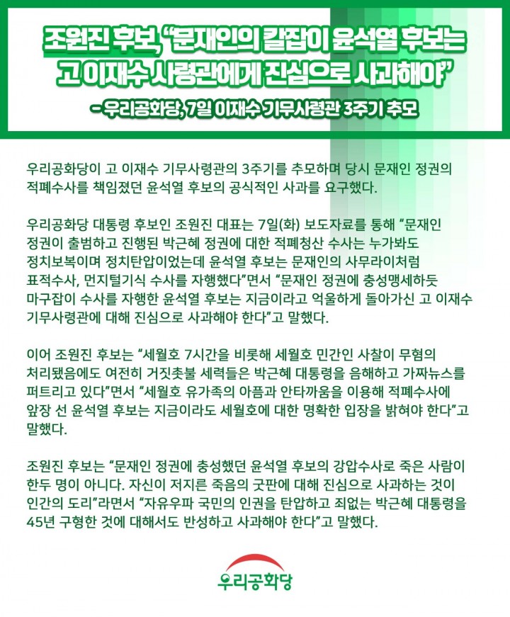 <º¸µµÀÚ·á> Á¶¿øÁø Èĺ¸, ¹®ÀçÀÎÀÇ Ä®ÀâÀÌ À±¼®¿ È帴 °í ÀÌÀç¼ö »ç·É°ü¿¡°Ô Áø½ÉÀ¸·Î »ç°úÇØ¾ß, ¿ì¸®°øÈ´ç, 7ÀÏ ÀÌÀç¼ö ±â¹«»ç·É°ü 3ÁÖ±â Ã߸ð