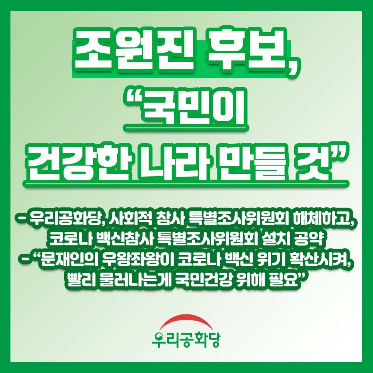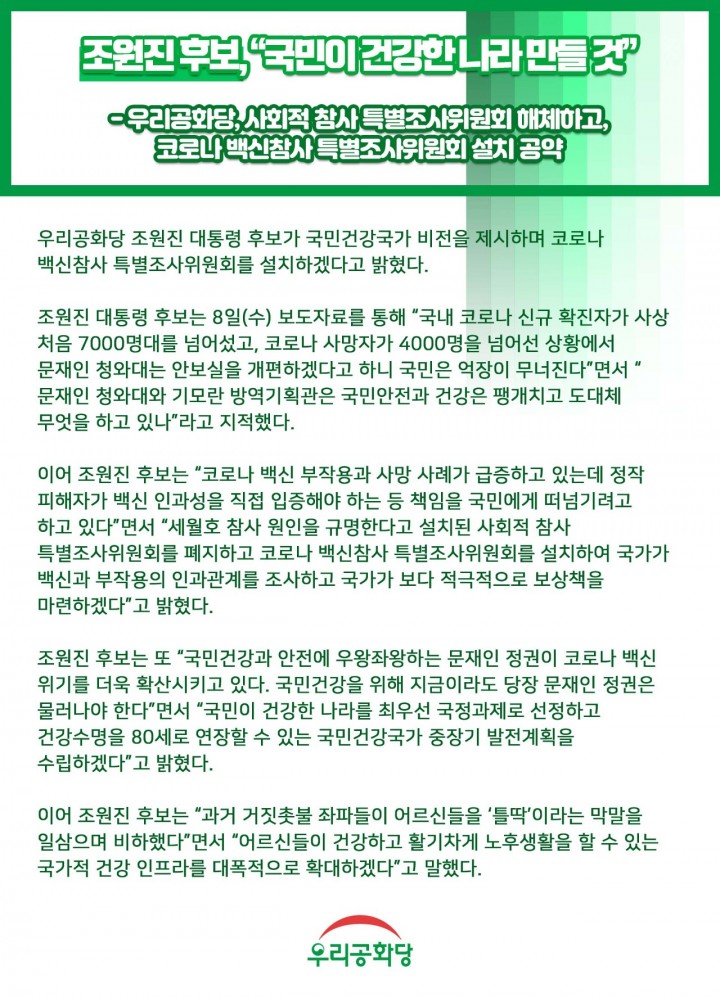 Á¦¸ñ : <º¸µµÀÚ·á> Á¶¿øÁø Èĺ¸, ±¹¹ÎÀÌ °Ç°ÇÑ ³ª¶ó ¸¸µé °Í, ¿ì¸®°øÈ´ç, »çȸÀû Âü»ç Ưº°Á¶»çÀ§¿øÈ¸ ÇØÃ¼Çϰí, Äڷγª ¹é½ÅÂü»ç Ưº°Á¶»çÀ§¿øÈ¸ ¼³Ä¡ °ø¾à