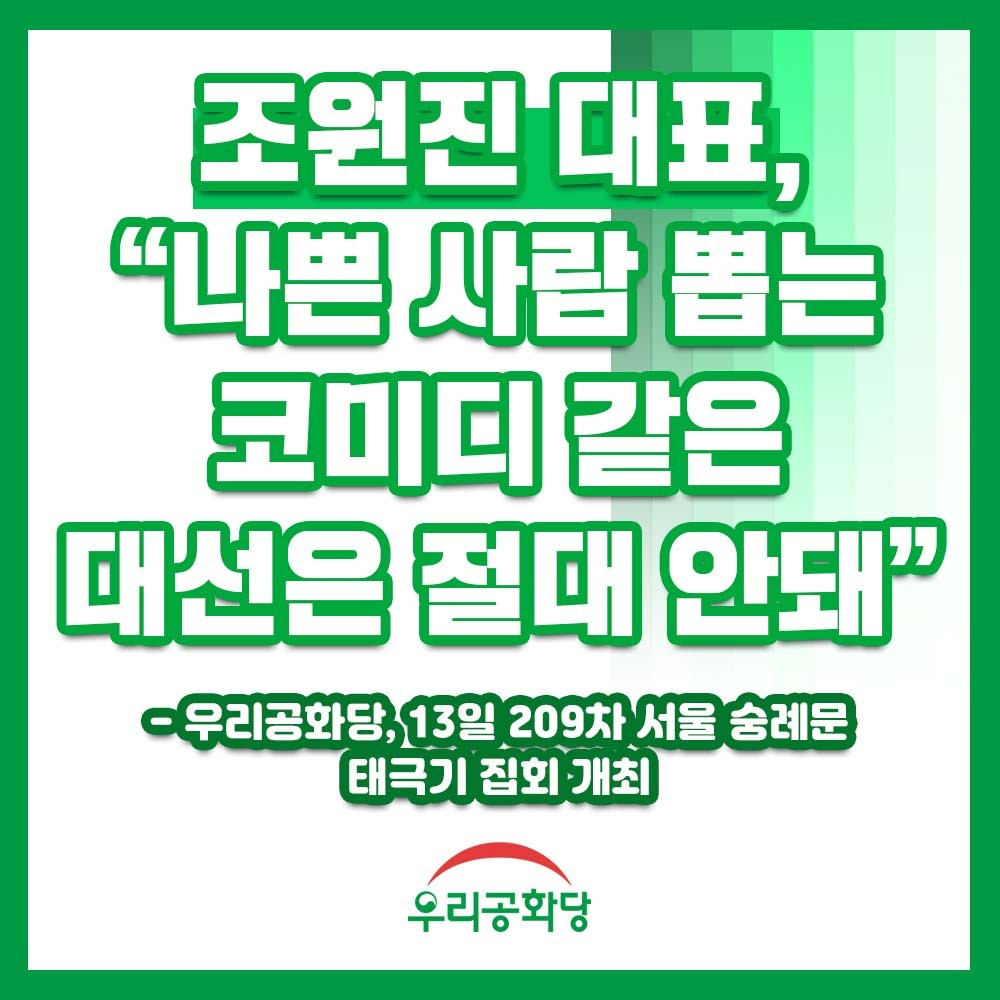 ¿ì¸®°øÈ´ç ´ë¼±Èĺ¸ÀÎ Á¶¿øÁø ´ëÇ¥´Â 13ÀÏ(Åä) 13½Ã, ¼¿ï ¼þ·Ê¹® ¿À°Å¸®¿¡¼ °³ÃÖµÈ Á¦209Â÷ űرâ Áýȸ¿¡¼ "´ëÇѹα¹ ±¹¹ÎÀÌ ÀÎÁ¤ÇÒ ¼ö ¾ø°í Á¤Ã¼¼ºµµ ¾ø°í ´ëÇѹα¹ ¿ª»ç¸¦ ¹è½ÅÇϰí Á¤ÀÇ¿Í Áø½ÇÀÌ ¾ø´Â ±×·¯ÇÑ È帵éÀÌ ´ëÅë·ÉÀÌ µÇ°Ú´Ù°í ÇÏ´Â À̹ø ´ë¼±Àº ±×¾ß¸»·Î Äڹ̵ð"¶ó¸é¼ "³ª»Û »ç¶÷À» »Ì¾Æ¾ß ÇÏ´Â Äڹ̵𠰰Àº ´ë¼±Àº Àý´ë ¾ÈµÈ´Ù"°í ÁÖÀåÇß´Ù.