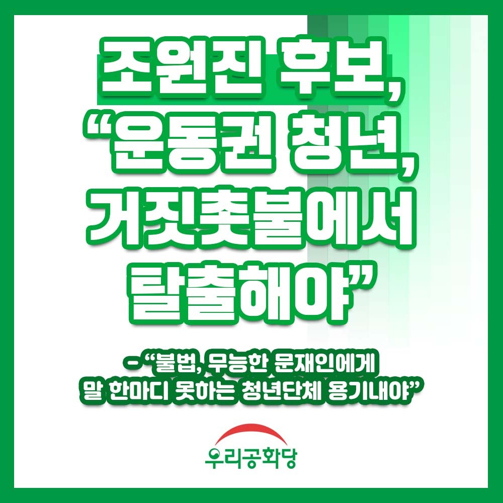 ¿ì¸®°øÈ´ç ´ë¼±Èĺ¸ÀÎ Á¶¿øÁø ´ëÇ¥´Â 16ÀÏ(È) º¸µµÀڷḦ ÅëÇØ "2022 ´ë¼±´ëÀÀ û³â ÇൿÀÇ ºÒÇÕ¸®ÇÑ ÇàŰ¡ ÂüÀ¸·Î ¾ÈŸ±õ°í ÇϷ绡¸® °ÅÁþÃкҿ¡¼ Å»ÃâÇØ¾ß ÇÑ´Ù"¸é¼ "ºÒ¹ý, ¹«´ÉÇÑ ¹®ÀçÀÎ ÁÂÆÄµ¶ÀçÁ¤±Ç¿¡°Ô ¸»ÇѸ¶µð Á¦´ë·Î ¸øÇÏ¸é¼ °ÅÁþÃкÒÀÇ µé·¯¸® ¿ªÇÒÀ» Çϴ û³â´Üü´Â ¿ë±â¸¦ ³»¾ß ÇÑ´Ù"¶ó°í ¸»Çß´Ù.