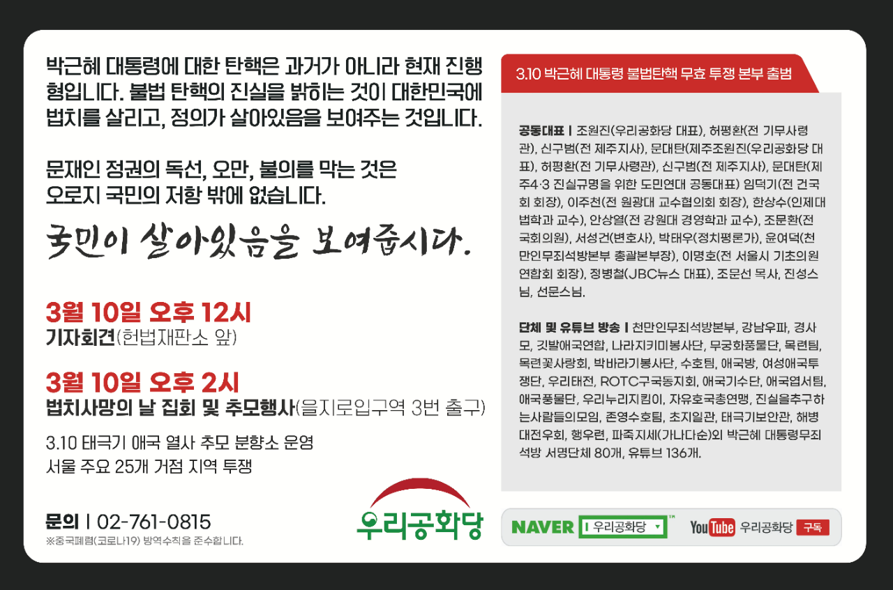 | 3/10(¼ö) 12:00 | ¿ì¸®°øÈ´ç ±âÀÚȸ°ß(Çå¹ýÀçÆÇ¼Ò ¾Õ) |