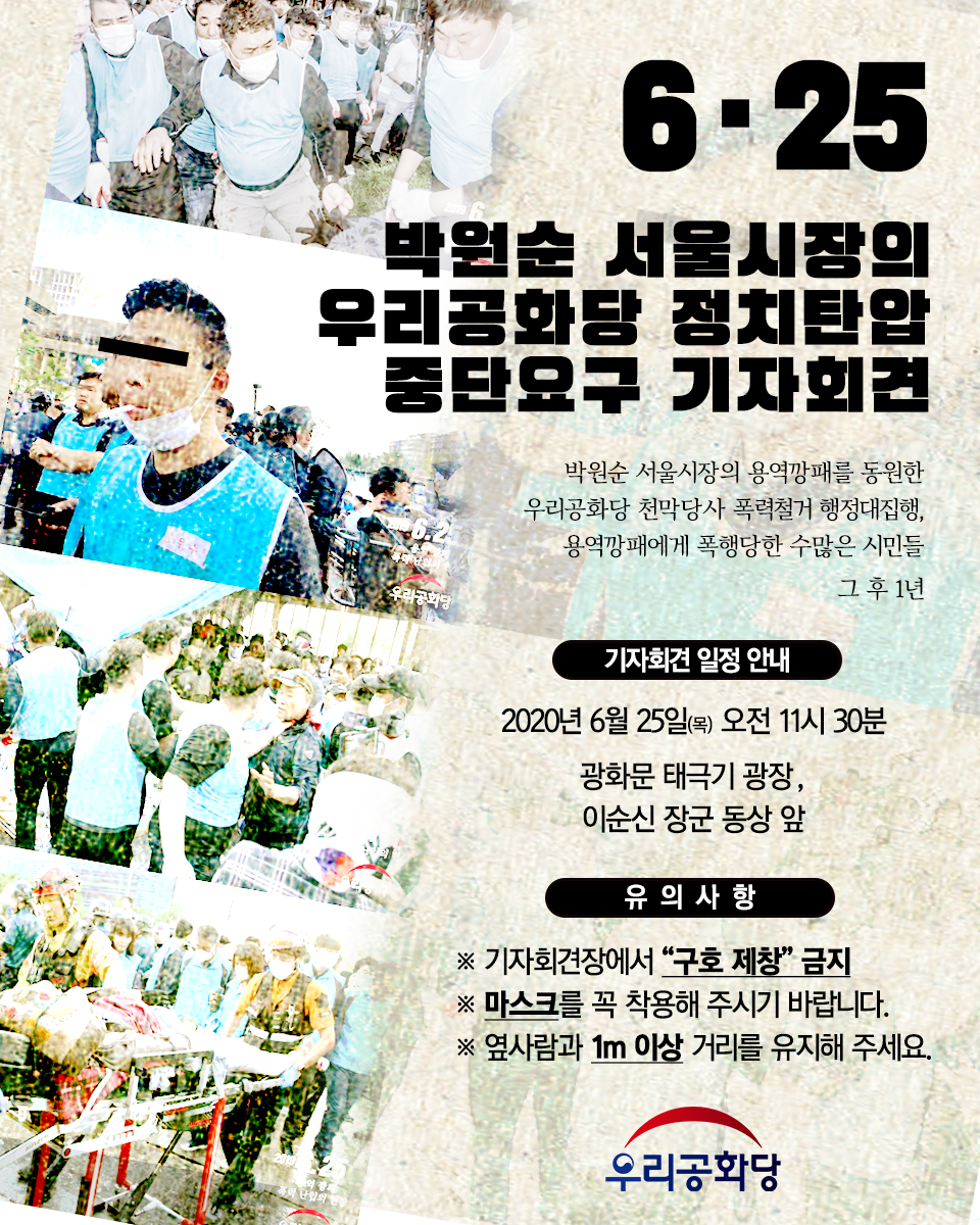 Á¦¸ñ : 20.06.25(¸ñ) ¹Ú¿ø¼ø ¼¿ï½ÃÀåÀÇ ¿ì¸®°øÈ´ç Á¤Ä¡Åº¾Ð Áߴܿ䱸 ±âÀÚȸ°ß : ¿ÀÀü 11½Ã 30ºÐ, ±¤È¹® űر⠱¤Àå, À̼ø½Å À屺 µ¿»ó ¾Õ