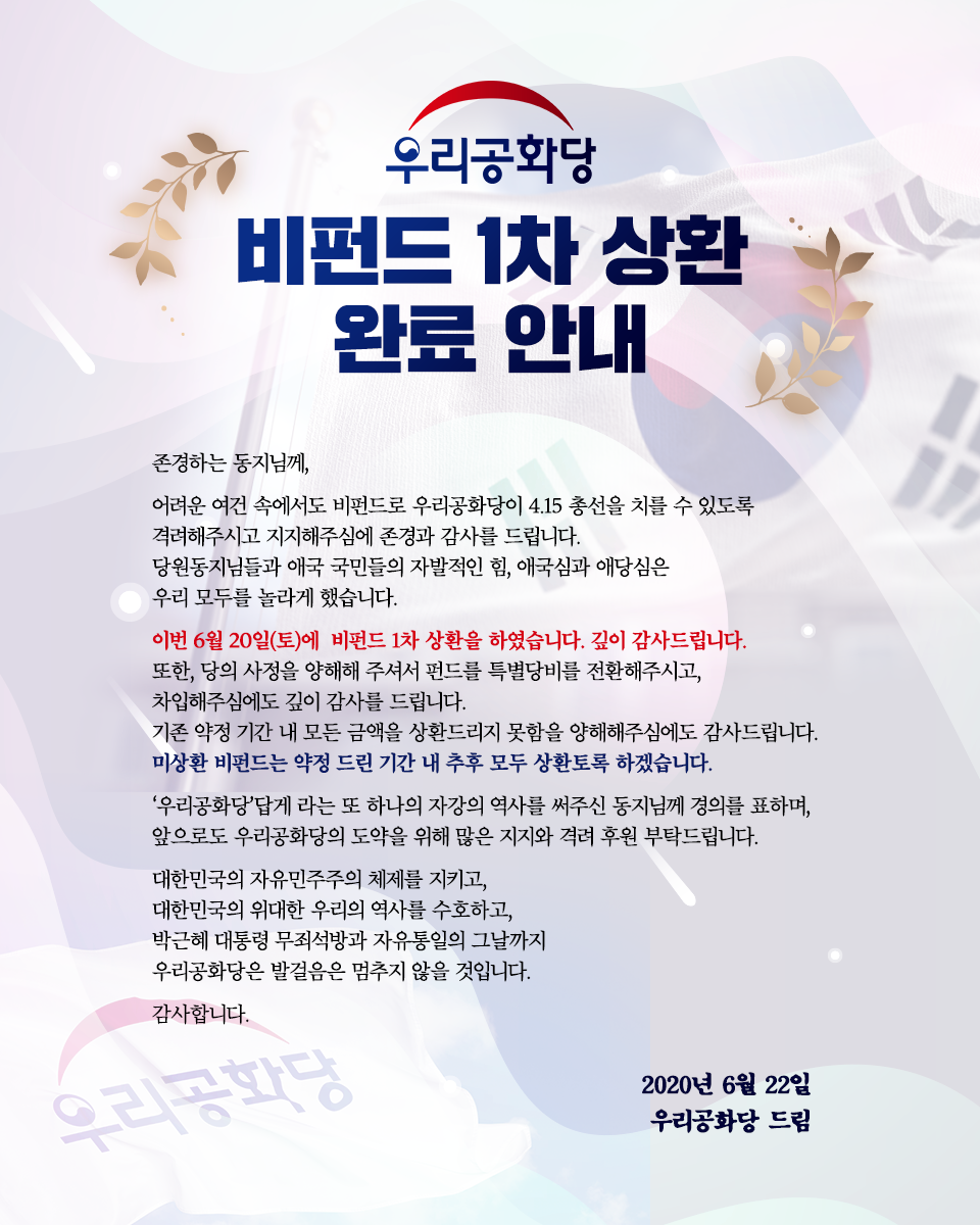 ¿ì¸®°øÈ­´ç ºñÆÝµå 1Â÷ »óȯ ¿Ï·á ¾È³» : °Ý·ÁÇØÁֽðí ÁöÁöÇØÁֽɿ¡ Á¸°æ°ú °¨»ç¸¦ µå¸³´Ï´Ù.