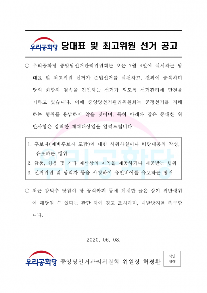 ¡Û ¿ì¸®°øÈ´ç Áß¾Ó´ç¼±°Å°ü¸®À§¿øÈ¸´Â ¿À´Â 7¿ù 4ÀÏ¿¡ ½Ç½ÃÇÏ´Â ´ç´ëÇ¥ ¹× ÃÖ°íÀ§¿ø ¼±°Å°¡ Áعý¼±°Å¸¦ ½ÇõÇϰí, °á°ú¿¡ ½Âº¹ÇÏ¸ç ´çÀÇ ÈÇÕ°ú °á¼ÓÀ» °ßÀÎÇÏ´Â ¼±°Å°¡ µÇµµ·Ï ¼±°Å°ü¸®¿¡ ¸¸ÀüÀ» ±âÇϰí ÀÖ½À´Ï´Ù. ÀÌ¿¡ Áß¾Ó´ç¼±°Å°ü¸®À§¿øÈ¸´Â °øÁ¤¼±°Å¸¦ ÀúÇØÇÏ´Â ÇàÀ§¸¦ ¿ë³³ÇÏÁö ¾ÊÀ» °ÍÀ̸ç, ƯÈ÷ ¾Æ·¡¿Í °°Àº Áß´ëÇÑ À§¹Ý»çÇ×Àº °·ÂÇÑ Á¦Àç´ë»óÀÓÀ» ¾Ë·Áµå¸³´Ï´Ù.