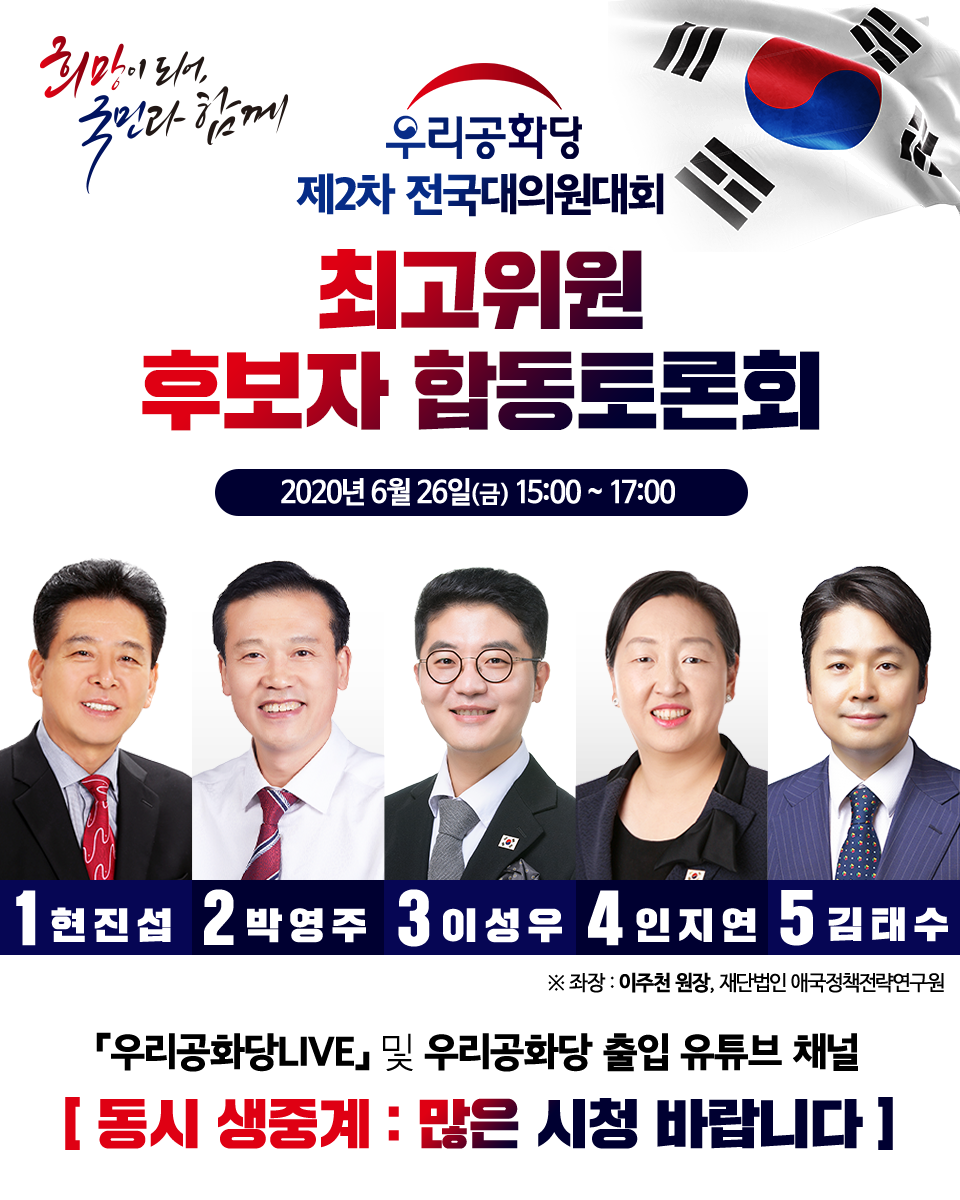 ¿ì¸®°øÈ´ç Á¦2Â÷ Àü±¹´ëÀÇ¿ø´ëȸ ÃÖ°íÀ§¿ø Èĺ¸ÀÚ ÇÕµ¿Åä·Ðȸ ÀÏÁ¤ ¾È³» : 6/26(±Ý) 15:00-17:00