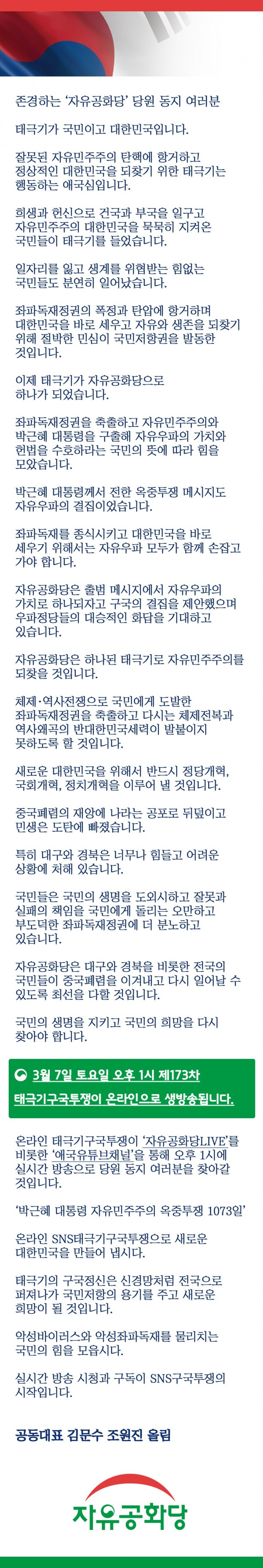 3/10(È) ¹Ú±ÙÇý ´ëÅë·É ºÒ¹ýźÇÙ 3³â, ÀÚÀ¯°øÈ´ç ±âÀÚȸ°ß ¹æ¼Û ¾È³» : ¿ÀÈÄ 1½ÃºÎÅÍ ÀÚÀ¯°øÈ´ç °ü·Ã À¯Æ©ºê¸¦ ½ÃÃ»ÇØ ÁÖ¼¼¿ä