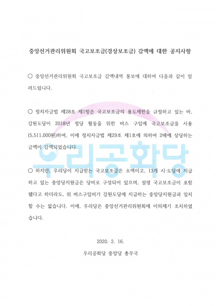 Áß¾Ó¼±°Å°ü¸®À§¿øÈ¸ ±¹°íº¸Á¶±Ý(°æ»óº¸Á¶±Ý) °¨¾×¿¡ ´ëÇÑ °øÁö»çÇ×