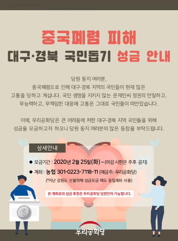 ÀÌ¿¡, ¿ì¸®°øÈ´çÀº Å« ¾î·Á¿ò¿¡ óÇÑ ´ë±¸¡¤°æºÏ Áö¿ª ±¹¹ÎµéÀ» À§ÇØ ¼º±ÝÀ» ¸ð±ÝÇϰíÀÚ ÇÏ¿À´Ï ´ç¿ø µ¿Áö ¿©·¯ºÐÀÇ ¸¹Àº µ¿ÂüÀ» ºÎʵ右´Ï´Ù.