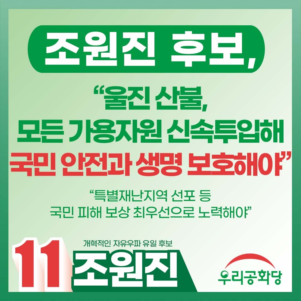 Á¶¿øÁø Èĺ¸, "¿ïÁø »êºÒ, ¸ðµç °¡¿ëÀÚ¿ø ½Å¼ÓÅõÀÔÇØ ±¹¹Î ¾ÈÀü°ú »ý¸í º¸È£Çؾß"(2022-03-04)