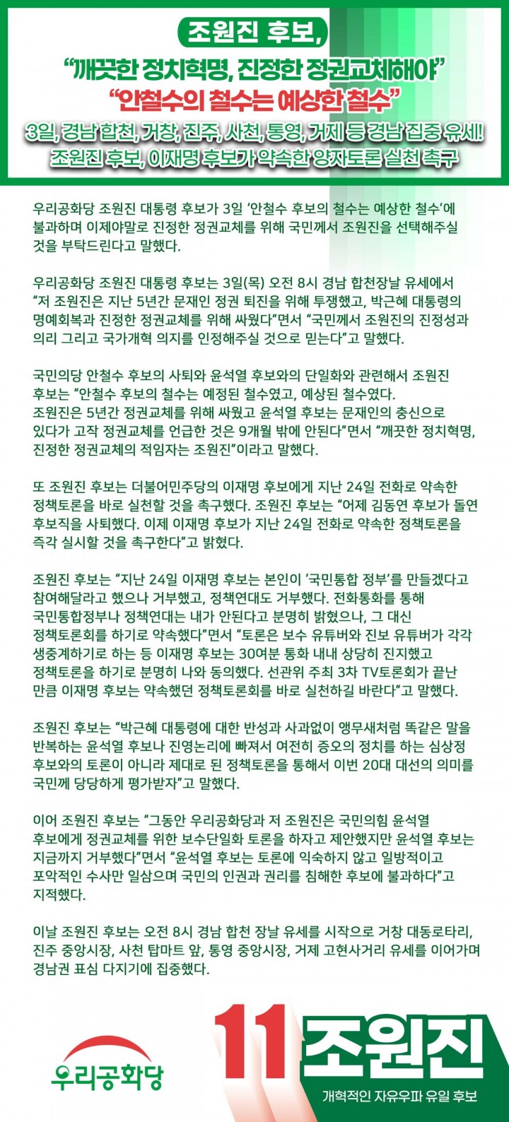 Á¶¿øÁø Èĺ¸, "±ú²ýÇÑ Á¤Ä¡Çõ¸í, ÁøÁ¤ÇÑ Á¤±Ç±³Ã¼Çؾß", "¾Èö¼öÀÇ Ã¶¼ö´Â ¿¹»óÇÑ Ã¶¼ö"(2022-03-03)