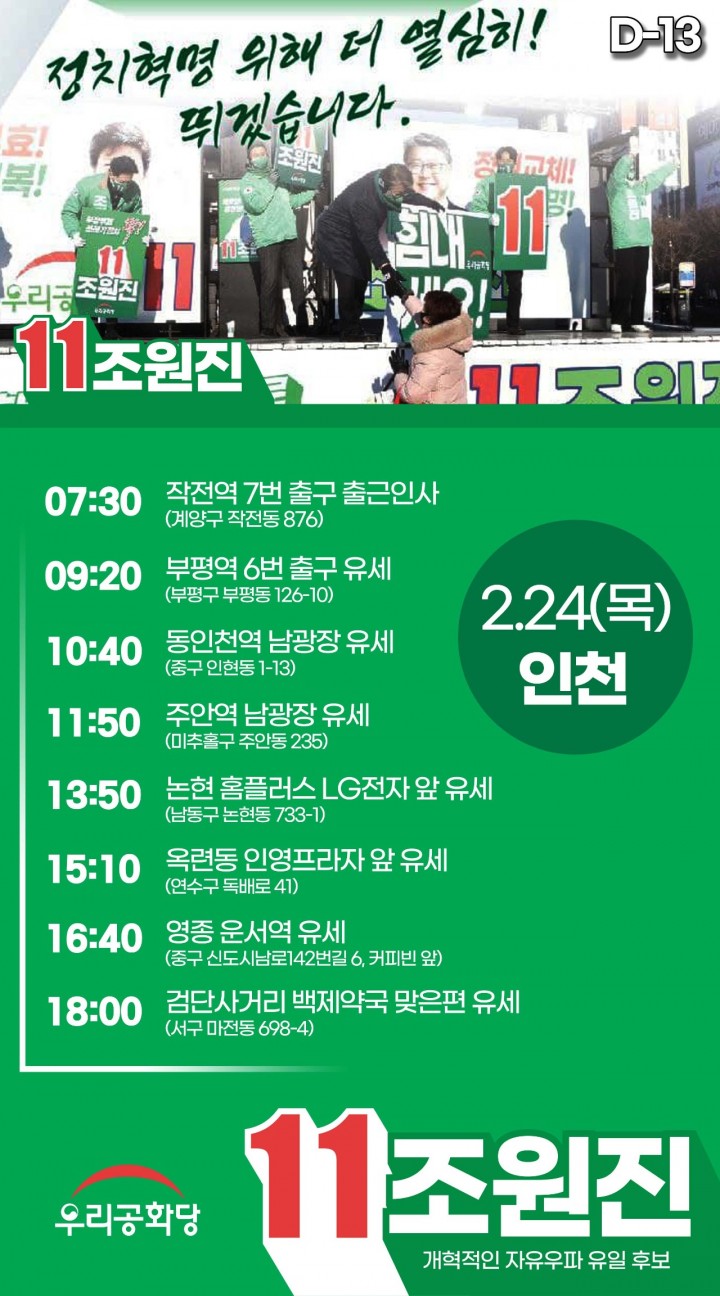 2/24(¸ñ) [ÀÎõ] 11¹ø Á¶¿øÁø ¿ì¸®°øÈ´ç ´ëÅë·É Èĺ¸ ÀÏÁ¤