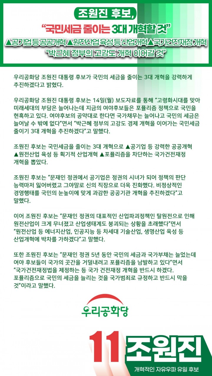 Á¦¸ñ : Á¶¿øÁø Èĺ¸, ±¹¹Î¼¼±Ý ÁÙÀÌ´Â 3´ë °³ÇõÇÒ °Í(220214)