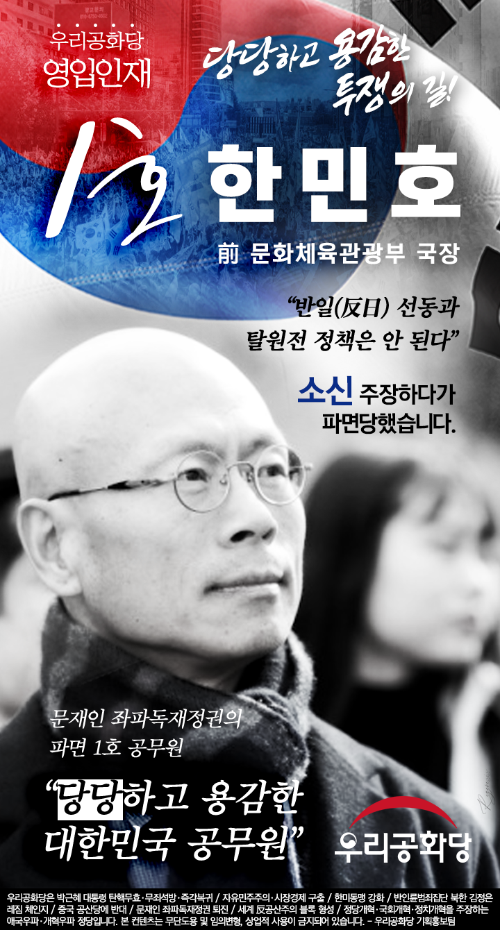 ÇѹÎÈ£ Àü ±¹ÀåÀº ¼¿ï´ëÇб³ »ç¹ü´ëÇÐ ¿ª»ç±³À°°ú¸¦ ³ª¿Í ±³»ç»ýȰÀ» ÇÏ´Ù°¡ ÇàÁ¤°í½Ã¸¦ °ÅÃÄ ¹®È°ü±¤ºÎ¿¡¼ ¹®ÈÁ¤Ã¥ °ü·Ã Àü¹® °ø¹«¿øÀ¸·Î¼ ±¹°¡¿¡ Ãæ¼ºÇؿ ¹®ÈÁ¤Ã¥ Àü¹®°¡, ¡®Àß ³ª°¡´ø ´ëÇѹα¹ °ø¹«¿ø¡¯À̾ú´Ù. ¹®ÀçÀÎ Á¤±Ç¿¡ ´ëÇØ ¿Ã¹Ù¸¥ ºñÆÇÀ» ÇÏ´Ù°¡ µµ¸®¾î ÆÄ¸é ´çÇÔÀ¸·Î½á ºÒ¸í¿¹°¡ ¾Æ´Ñ ¹®ÀçÀÎ ÁÂÆÄµ¶ÀçÁ¤±Ç¿¡ ÀÇÇØ ÆÄ¸é´çÇÏ´Â ´ëÇѹα¹ ÁøÂ¥ °ø¹«¿øÀÇ ¿ë°¨ÇÑ ¸ð½ÀÀ» µå·¯³»´Â ¿µ¿¹¸¦ ¾È°Ô µÇ¾ú´Ù´Â Æò°¡¸¦ ¹Þ´Â´Ù.