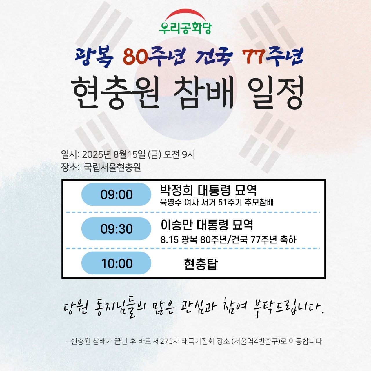 ¡Û 09:30 À̽¸¸´ëÅë·É ¹¦¿ª Âü¹è(8.15 ±¤º¹80ÁÖ³â/°Ç±¹77ÁÖ³â ÃàÇÏ)